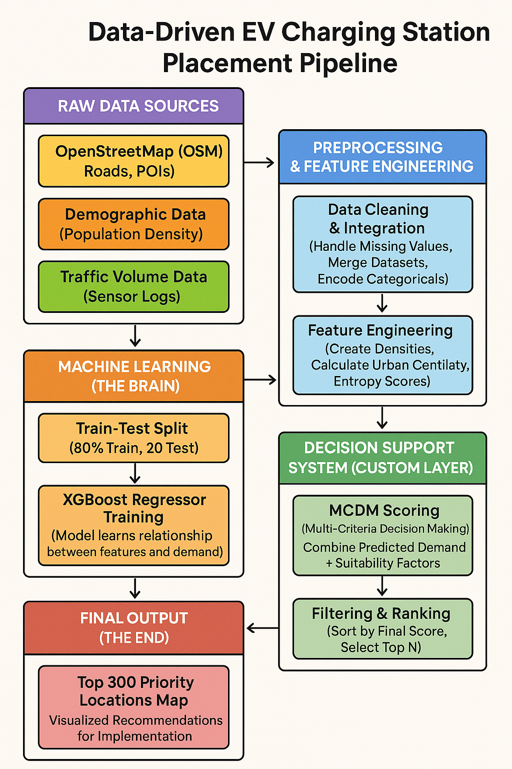 Predicted_Demandscore for every grid cell in the city. - Step 2: MCDM Scoring (The Custom Layer): We implemented a Multi-Criteria Decision Making (MCDM) layer. This takes the raw demand score and weights it against “suitability” metrics (e.g., ensuring we don’t build in the middle of a highway).